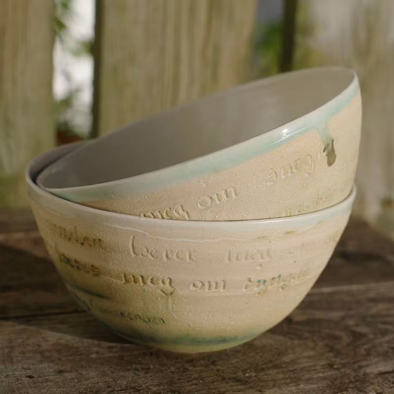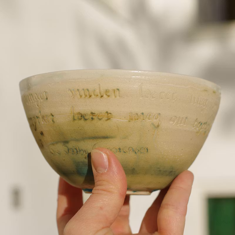 Skålen er dreid for hånd. Tekst skrevet på for hånd. Glasuren er blank inni og matt utenpå