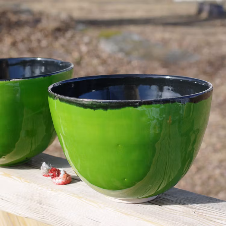Skålen er dreid for hånd. Glasurene er giftfrie og skålen kan brukes til kald og varm mat.
